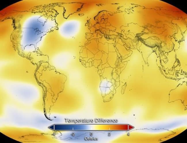 - Mapa exibe a média da temperatura global de 2014; partes em azul representam clima mais frio do que o normal, enquanto em vermelho, clima mais quente do que o normal.