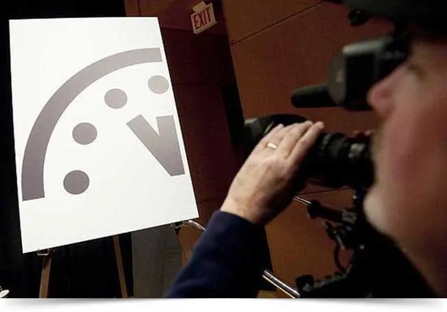 A incerteza gerada pela ameaça de proliferação nuclear e pelo aquecimento global fez o BAS (Boletim de Cientistas Atômicos) adiantar em um minuto o “Relógio do Apocalipse”, informaram na terça-feira especialistas internacionais. O simbólico Relógio do Apocalipse “aponta agora cinco minutos para a meia-noite [quando ocorrerá o cataclisma nuclear]”, declarou Allison Macfarlan, presidente da associação da Universidade de Chicago que em 1947 criou o sistema para ilustrar o risco da corrida atômica.