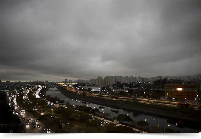 São Paulo começou a tarde desta segunda-feira (19) com o céu encoberto por nuvens e o “dia virou noite”. O fenômeno está relacionado à chegada de uma frente fria e também de partículas oriundas da fumaça produzida em incêndios florestais.