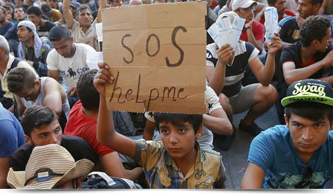Menino sírio, provavelmente sozinho, pede socorro entre refugiados.