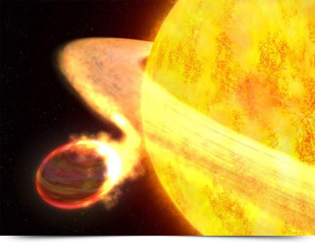 Localizado na constelação de Auriga (também conhecida como Cocheiro), a 600 anos-luz da Terra, o planeta Wasp-12b está sendo devorado lentamente pela sua estrela, a Wasp-12. O planeta gigante orbita tão próximo à estrela semelhante ao Sol que sua temperatura chega a 1.500ºC.